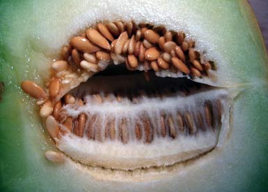 Exotische Frucht aus dem Handel, saftig und süß. Unterart der Netzmelone Sie ist reif, wenn sie auf Druck mit dem Finger leicht nachgibt, sich aber noch nicht weich anfühlt.