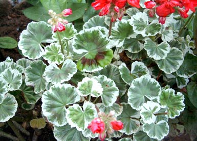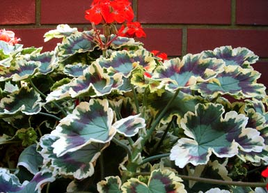 Pelargonie fancy leaf pelargonium fancy leaf geranium Pelargonium "contrast" und andere Storchschnabelgewächse Besondere Zuchtformen der Pelargonien, die zwar auch hübsch blühen, sich aber nicht durch besondere oder große Blüten, sondern durch meist auffällig gezontes, mehr- |