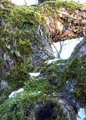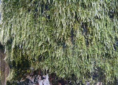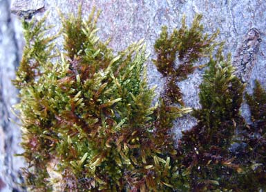 Art: Zypressenschlafmoos, fädige Form an senkrechtem Baumstamm