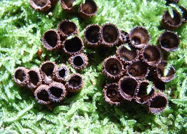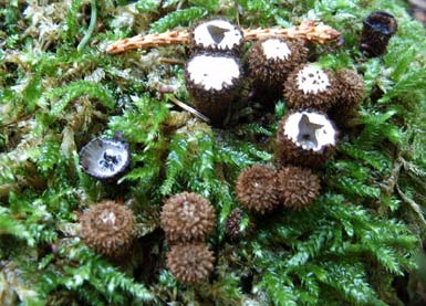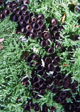 Kein Speisepilz: Ungenießbar Gefunden am Nadel- holz-Baumstümpfen ab August bis September Kleine Pilze, Höhe bis 2 cm