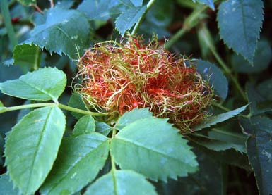 man das "Werk" der Rosengallwespe: Moosähnliche Gallen,