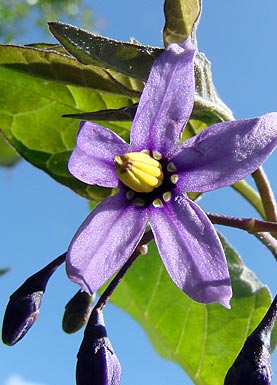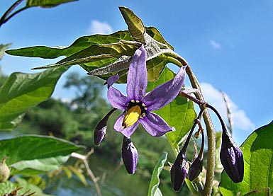 Nachtschatten trailing bittersweet Solanum dulcamara Lippenblütler Lamiaceae Bis zu tödlich giftiger Kletterer Blühend von Juni bis etwa August Beeren gleichzeitig mit den Blüten ab August bis in den Herbst Verwandt mit Nutz- pflanzen wie Tomate und Kartoffel, aber auch mit der Tollkirsche Besonders Kinder sollten auf die Gefahr aufmerksam gemacht werden, da die Pflanze nicht so selten ist und die Früchte so hübsch aussehen Findet man an und in feuchten Gebüschen, Wiesen und an Ufern Bei geeigneter Rank- möglichkeit wohl bis zu 2 m hoch, ich habe allerdings nur ca. 60 cm hohe Exemplare gefunden Blattunterseiten behaart |