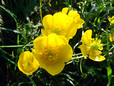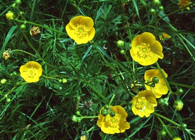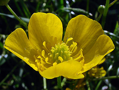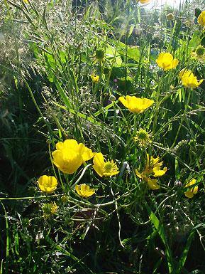 Blütezeit: ab Mai Bis ca. 60 cm hoch giftig (Anemonin) Da der niedrigere Kriechende Hahnenfuß meist Gärten zugeordnet wird, istdies wahrscheinlicher der scharfe Hahnenfuß.Die Blüten würden sich kaum unterscheiden, aber in Blättern und Höhe verschieden.