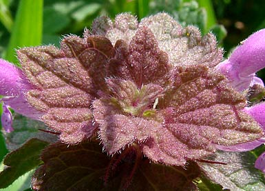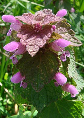 purple deadnettle Lamium purpureum Lippenblütler Lamiaceae Blüte ab Juni 10 - angeblich 40 cm hoch Habe aber bisher nur deutlich niedrigere Exemplare gefunden Gärten, Wiesen, Äcker, Wegrand, Schuttplätze, stickstoffreiche Böden Bei der Purpur-Taubnessel sind immer die obersten Blätter mit rötlich gefärbt Unangenehmer Geruch beim Zerreiben der Blätter |
