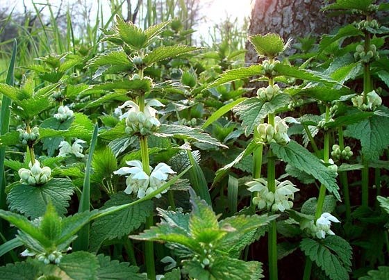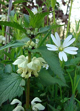 white deadnettle Lamium album Lippenblütler Lamiaceae Blüte ab Mai bis in den Herbst Bis ca. 60 cm hoch Wiesen, Äcker,Weg- ränder, Mauern, Hecken Haarige schneeweiße, eigentlich bei genauem Hinsehen wunderschöne Blüten Heilpflanze: innerlich als Tee gegen Verdauungsprobleme, Blasen- und Frauenleiden, äußerlich als Umschläge gegen Ausschläge und Hautkrankheiten |