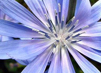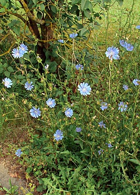 common chicory Cichorium intybus Korbblütler Asteraceae Blühend gefunden von Juli bis Oktober Bis ca. 95 cm hoch Am Wegrand und auf Schutt- und Ödflächen, aber auch auf saftigeren Böden wie Weiden gefunden Die Wegwarte hat außer der gezeigten Wildart noch 2 andere Unterarten, so die Kaffeezichorie und unseren Chicoree, der als Salat auch heute beliebt ist Altes Heilmittel, früher gegen fast alles empfohlen, es lässt sich kaum alles aufzählen Die Blüten sind nachts geschlossen und folgen tagsüber dem Lauf der Sonne (Heliotropismus) |