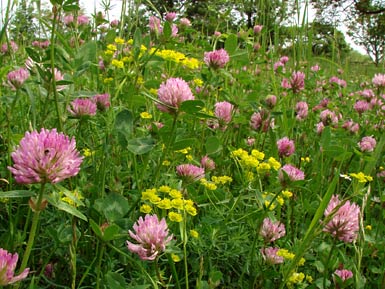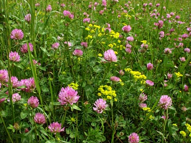 red clover Trifolium pratense Schmetterlingsblütler Fabaceae Blütezeit ab Mai bis weit in den Sommer Wiesen & Weiden Gute Bienenweide & Hummelblume, hochwertige Futterpflanze für Schafe und Rinder Ertragreich, rasch nachwachsend Bodenverbesserer, Vorfrucht für andere Kulturpflanzen Bis ca. 55 cm hoch |