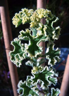 Straff aufrechte, schnell verholzende Zweige. Wächst völlig anders als die meisten Duftpelargonien. Sehr kleine, gelb-weiß panaschierte harte Blättchen. Ganz starker, wunderbar reiner Zitronen-Blattduft!